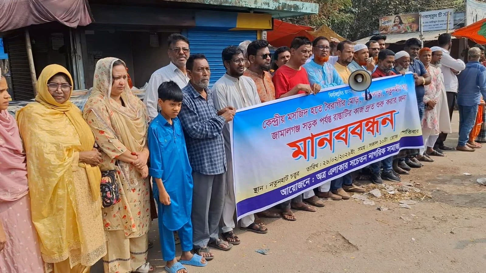 জয়পুরহাট শহরের কেন্দ্রীয় মসজিদ থেকে বৈরাগীর মোড়, চিত্রাপাড়া, নতুনহাট হয়ে জামালগঞ্জ সড়ক পর্যন্ত গুরুত্বপূর্ণ রাস্তাটির কাজ দ্রুত শুরু করার দাবিতে মানববন্ধন অনুষ্ঠিত হয়েছে।