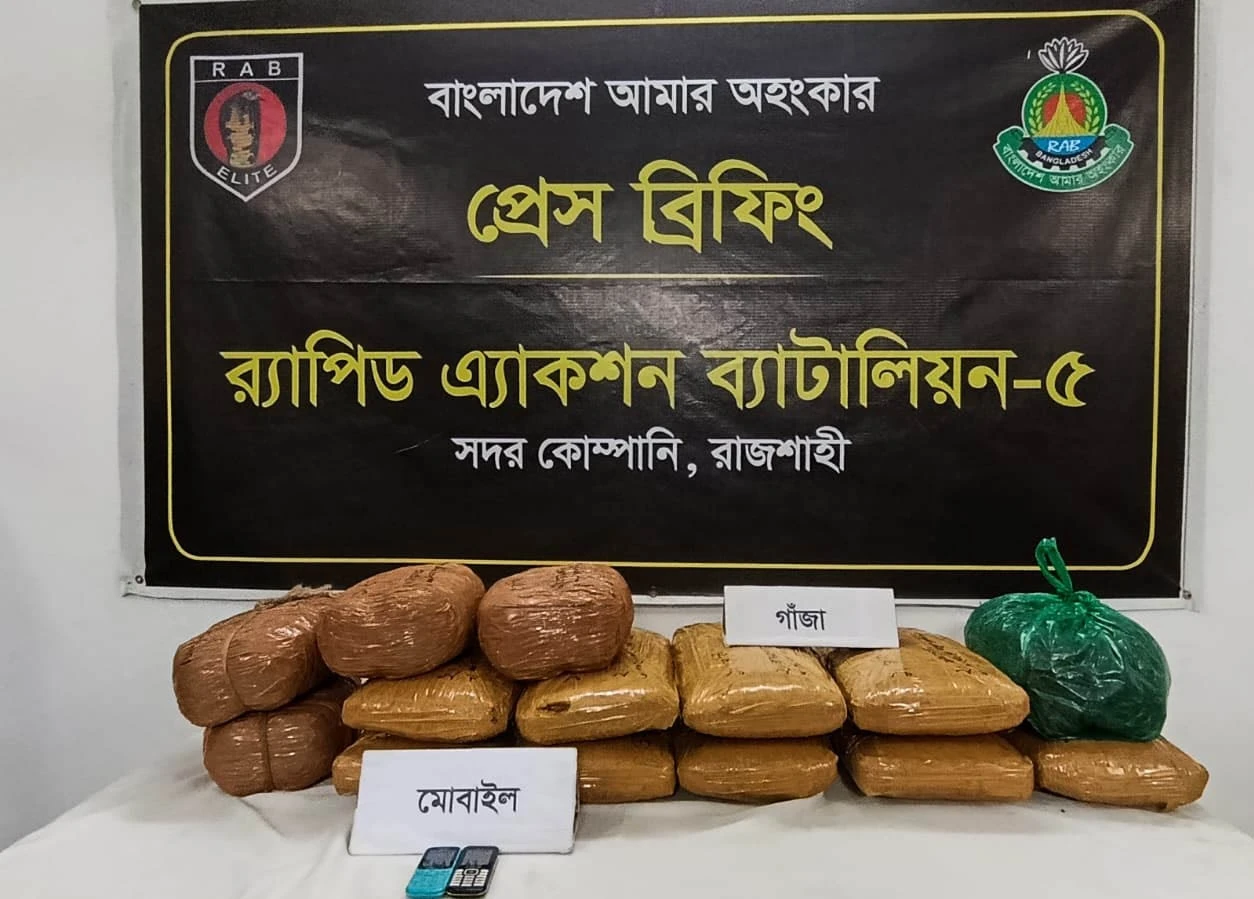 রাজশাহী মহানগরীতে অভিযান চালিয়ে বিপুল পরিমাণ গাঁজাসহ দুই মাদক কারবারিকে গ্রেফতার করেছে র্যাব-৫। বুধবার (২২ এপ্রিল ২০২৬) বিকেলে নগরীর রাজপাড়া থানার তেরোখাদিয়া পশ্চিমপাড়া এলাকায় এই অভিযান পরিচালিত হয়।